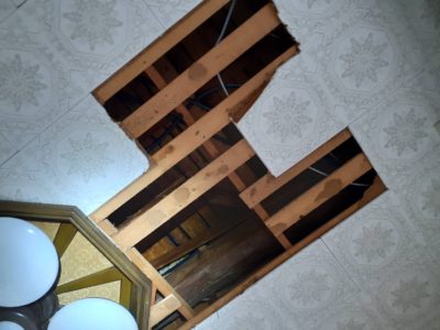 天井から蜜が滴り落ちていたのでご連絡したそうなのですが、お伺いすると点検口のない中天井。