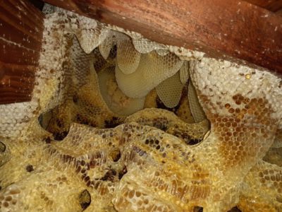 開口して中を見ると軒天にビッシリと黄金色に輝く巣があるではないか!
