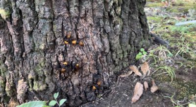 現場に着き案内していただいたのですが、木の幹にオオスズメバチが数匹たむろしてました。