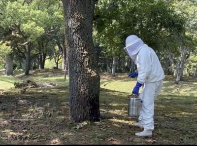 万が一もありますので、飛んできているハチは駆除し、薬剤を散布して飛来を防止する措置を取りました。