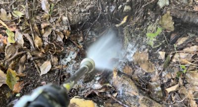 場所がツツジの中でしたので、非常にやりづらかったですが、巣穴を見つけ、動噴機で薬剤を流し込み一気に駆除します。