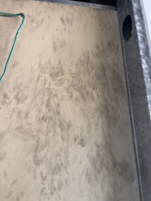 壁の中なか鳴き声がする、音がすると言うことなので、許可をいただいて、壁を剥がしてみると、何となんと足跡だらけではありませんか!