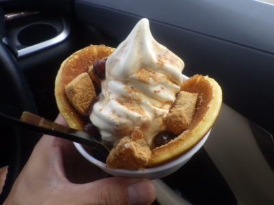 週末、和菓子屋さんでソフトクリーム食べて、プールに