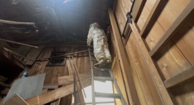 床も腐って足場も悪く、巣の発見にはかなりの時間を要しましたが、軒天に巨大な巣を発見。
